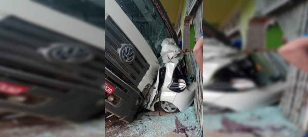 Caminhão desgovernado desce ladeira e atinge carro de casal que fica preso nas ferragens