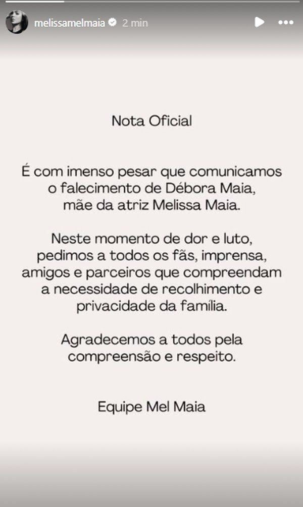 “É com imenso pesar que comunicamos o falecimento de Débora Maia, mãe da atriz Melissa Maia. Pedimos compreensão quanto ao recolhimento e à privacidade da família”, diz a nota.